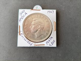 Moneda de 5 Shillings de Sudáfrica del año 1949. - Año: 1949 - Denominación: 5 Shillings - País: Sudáfrica - Diseño con el retrato del Rey Jorge VI. - Inscripción GEORGIVS SEXTVS REX y SUD AFRICA 5 SHILLINGS. - Reverso con el escudo de Sudáfrica.