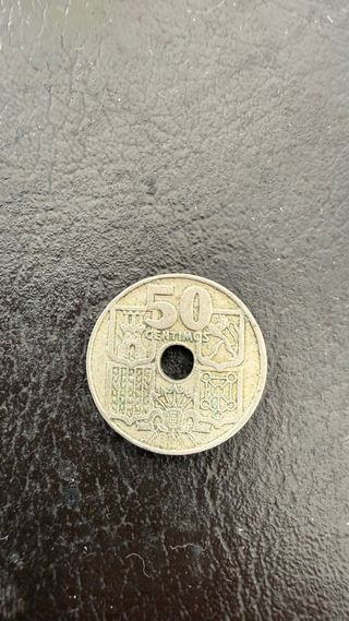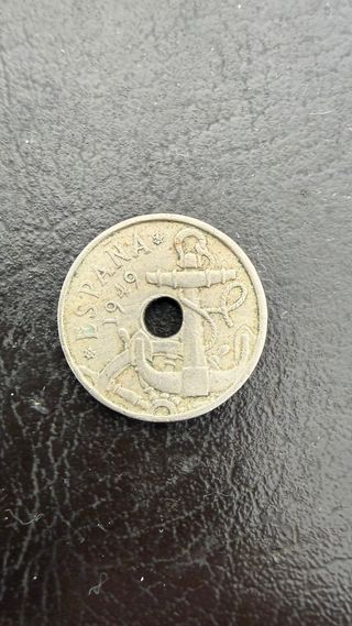 Moneda de 50 céntimos del año 1949. - Diseño con escudo. - Agujero central.