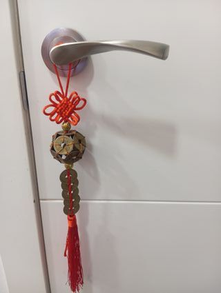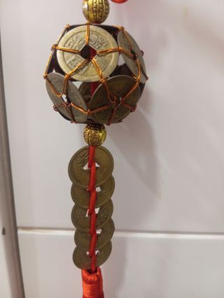 Adorno tradicional chino con un nudo y monedas. Pieza colgante de Nudo chino con monedas de la suerte, símbolo ancestral de prosperidad, protección y flujo constante de abundancia 🍀✨. El nudo representa el infinito y la continuidad de la buena fortuna, mientras que las monedas atraen riqueza, éxito y oportunidades. Ideal para colgar en el hogar, negocio o como amuleto energético. Combinalo con otros productos para pagar solo un gasto de envío Descubre más productos en nuestro perfil. La Holistika.