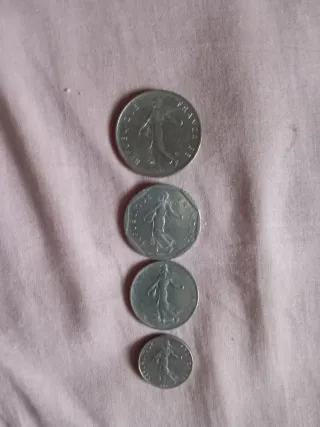 Conjunto de cuatro monedas de francos franceses. - Moneda de 1 Franco de 1960. - Moneda de 1 Franco de 1991. - Moneda de 2 Francos de 1977. - Moneda de 5 Francos de 1991.