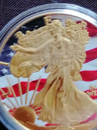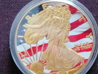 Moneda conmemorativa de la Libertad Americana, con diseño de la Estatua de la Libertad y la bandera de Estados Unidos. Diseño detallado de la figura de la libertad. Fondo con la bandera estadounidense. Acabado metálico brillante. Mas cosas en mi perfil que puede interesar y agrupar.