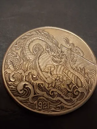 Moneda de colección de 1 dólar de Estados Unidos, acuñada en 1921. Presenta un diseño detallado con un dragón y olas. - Año: 1921 - País: Estados Unidos - Diseño: Dragón y olas