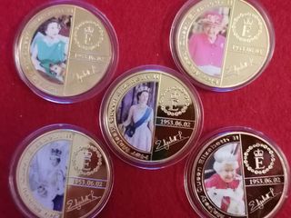 Conjunto de 5 monedas conmemorativas de la Reina Isabel II. Cada moneda presenta una imagen de la Reina en diferentes etapas de su vida. Incluyen la fecha 1953.06.02 y su firma. Diseño con el emblema de la corona y la letra E.