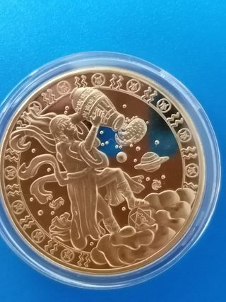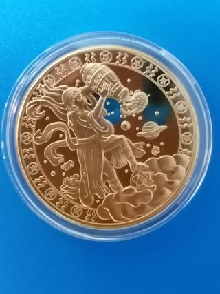 Moneda conmemorativa del signo zodiacal Acuario. Diseño detallado de Acuario vertiendo agua. Símbolos zodiacales y elementos celestes en el borde. De metal dorado y de 4 cm de diametro.
