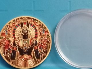 Detalle de moneda con diseño del dios Anubis. Representación del dios Anubis de metal dorado en alto relieve, de 4 cm de diametro. Diseño con múltiples colores y detalles. Otras cosas en mi perfil.