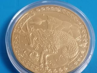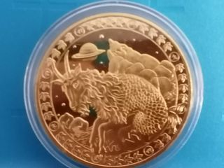 Moneda conmemorativa del signo zodiacal Capricornio, de 4 cm de diametro. Diseño detallado de una cabra montesa. Motivos celestiales y montañosos. Borde decorado con símbolos. Tengo otros signos en mi perfil.