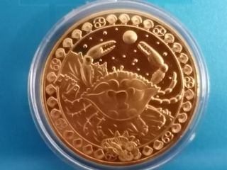 Moneda conmemorativa del signo zodiacal Cáncer. Diseño detallado de un cangrejo. Borde decorado con conchas y el símbolo de Cáncer. Otras monedas del Zodiaco en mi perfil.