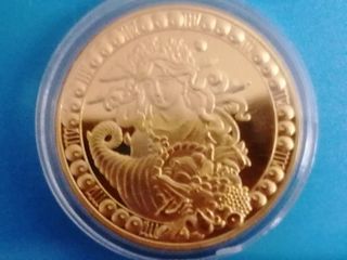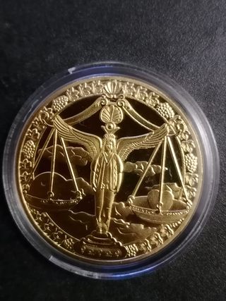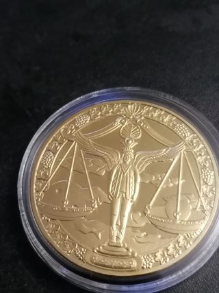 Moneda conmemorativa con diseño de la Libra y una balanza. Acabado dorado brillante. Detalle de alas y figura central. Otras monedas del zodiaco en mi perfil.