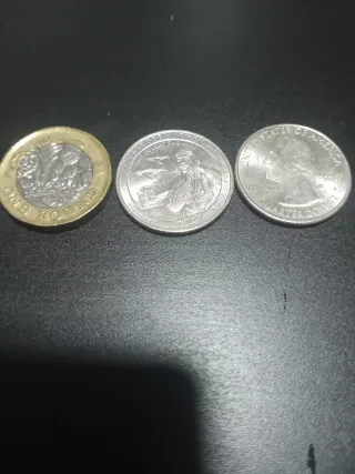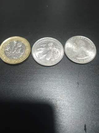 Conjunto de tres monedas de diferentes países. - Una moneda de 1 Libra esterlina. - Una moneda conmemorativa de 2021. - Una moneda de Quarter Dollar de Estados Unidos.