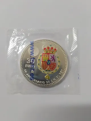 Moneda de plata de 30€ conmemorativa del 50 aniversario del Rey Felipe VI. Año 2018. Anverso: Rey Felipe VI. Reverso: Escudo en color del Rey Felipe VI Tirada: 1000000 de unidades.
