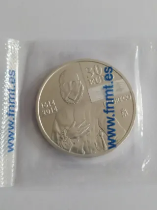 Moneda de plata de 30 euros del año 2014. Conmemorativa del IV centenario de la muerte del Greco. Acuñada en España. Anverso: Rey Juan Carlos y Reina Sofía. Reverso: Escena de "El caballero de la mano en el pecho" Fecha de emisión año 2014. Tirada máxima: 2000000 unidades. Acuñación estimada: 366800 unidades