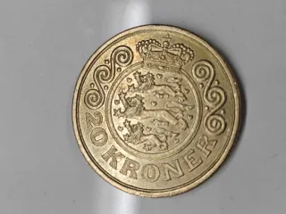 Moneda de Dinamarca con valor de 20 Kroner. Presenta un diseño detallado con el escudo de armas del país. - Diseño con tres leones coronados. - Borde decorado con espirales.