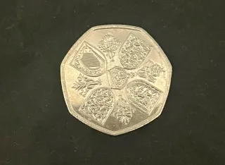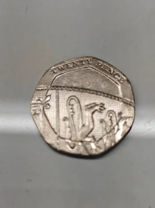 Moneda británica de 20 peniques con el retrato de la Reina Isabel II. - Canto con inscripciones. - Diseño heptagonal.