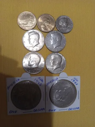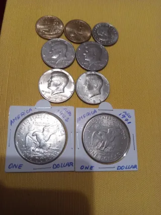 Lote de monedas de colección. 9 monedas - Monedas de dólar.Yokawanda,Sacagawea y Liberty - Monedas de medio dólar Kennedy 77/82/84/89 - 2 Monedas dolar Eisenhouer