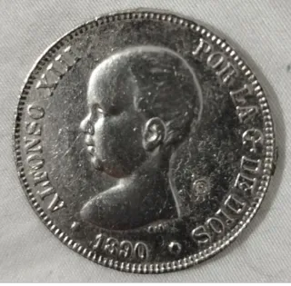 Moneda de 5 pesetas del año 1890. - Canto con inscripción POR LA GRACIA DE DIOS. - Anverso con el retrato de Alfonso XIII niño. - Reverso con el escudo de España.