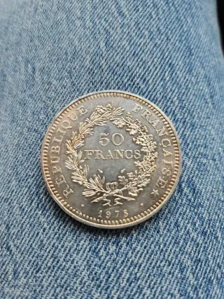 Moneda de 50 francos franceses del año 1978. - Diseño con Liberté, Égalité, Fraternité y figuras alegóricas. - Borde con detalles. - Grabado de RF y 1978 en la parte inferior.