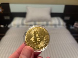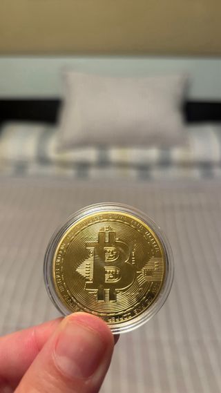 Moneda conmemorativa de Bitcoin, con un acabado dorado brillante. - Diseño detallado del símbolo de Bitcoin. - Presentada en una cápsula protectora transparente. - Criptomoneda icónica. - Ideal para Regalo a inversores/criptobros Se muestra en Gijón sin compromiso o envía a península!