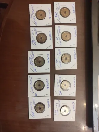 Monedas de 25 pesetas de España. Se venden cada una individualmente a 2€. - Moneda de 25 pesetas de los Juegos Olímpicos de 1990. - Moneda de 25 pesetas de los Juegos Olímpicos de 1991. - Moneda de 25 pesetas de Canarias de 1994. - Moneda de 25 pesetas de Castilla y León de 1995. - Moneda de 25 pesetas de Juan Carlos I de 1997. - Moneda de 25 pesetas EXP-92 de 1992. - Moneda de 25 pesetas PLUS UNESCO de 1993. - Moneda de 25 pesetas de Castilla-La Mancha de 1996. - Moneda de 25 pesetas de Ceuta de 1998.