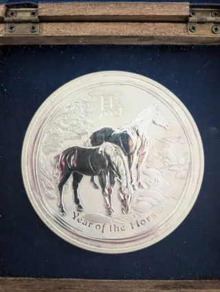 Moneda de plata conmemorativa del Año del Caballo 2014. - Peso: 1 kg - Material: Plata - Diseño: Dos caballos y carácter chino 'Ma' (caballo) - Inscripción: Year of the Horse