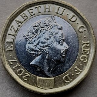 Moneda de una libra británica del año 2017 - Borde dorado y centro plateado.
