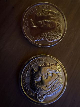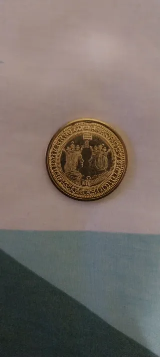 Moneda dorada con un diseño detallado en relieve. - Escudo central. - Inscripción en el borde.