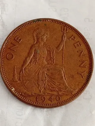 Moneda de 1 penique con la efigie de Jorge VI. - Anverso: GEORGIVS VI D. G. BR. OMN. REX F. D. IND. IMP. - Reverso: ONE PENNY y el año (no visible en la imagen).