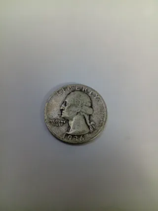 Moneda de un cuarto de dólar con el año 1934. - Diseño de Liberty en el anverso. - Inscripción In God We Trust.