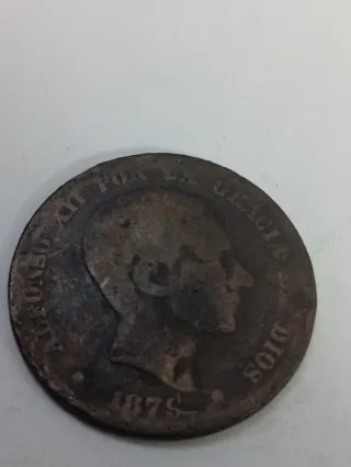 Moneda de 10 céntimos de Alfonso XII, acuñada en el año 1879. - Diseño con el perfil del rey Alfonso XII. - Inscripción ALFONSO XII POR LA G. DE DIOS y 1879.