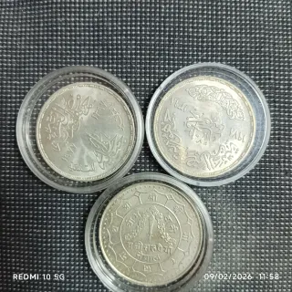 Conjunto de tres monedas antiguas para coleccionistas. Cada moneda tiene un diseño único. - Una moneda con inscripciones en árabe y el año 1977. - Otra moneda con inscripciones en árabe y el año 1978. - Una moneda con inscripciones en nepalí y el número 1.
