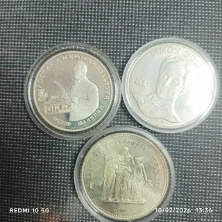 Conjunto de tres monedas de colección. - Moneda conmemorativa de Rusia y la cultura mundial, dedicada a Fiódor Shaliapin. - Moneda conmemorativa de Simon Boll, con fechas 1830-1980. - Moneda con la inscripción Liberté, Égalité, Fraternité.