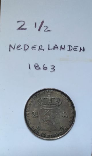 Moneda de 2 1/2 gulden de los Países Bajos, acuñada en el año 1863. - Denominación: 2 1/2 Gulden - Año: 1863 - País: Países Bajos (Nederlanden)