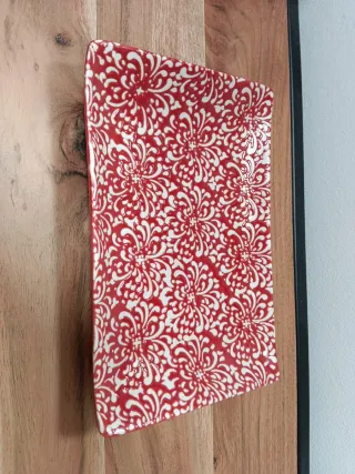 Bonito vacía bolsillos de porcelana con un diseño floral en rojo y blanco. Ideal para dejar las llaves, monedas o pequeños objetos.Mide 20'5 por 13'5. - Material: Porcelana. - Diseño: Estampado floral. - Color: Rojo y blanco.