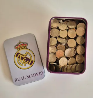 - Caja metálica con el escudo del Real Madrid. - Con más de 570 monedas de 5 pesetas. - Más de 1,5kg