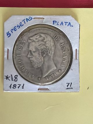 Moneda de plata de 5 pesetas del rey Amadeo I, acuñada en el año 1871. - Canto con estrellas y año. - Inscripción: REY DE ESPANA. - Marca de ceca: *18. - Marca de valor: 71.