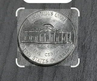 Moneda de colección de 5 centavos de Estados Unidos, con el diseño de Monticello. La imagen muestra el anverso de una moneda de cinco centavos de dólar estadounidense, conocida como "Jefferson Nickel". - Reverso: Monticello. - Anverso: E PLURIBUS UNUM, UNITED STATES OF AMERICA, FIVE CENTS.