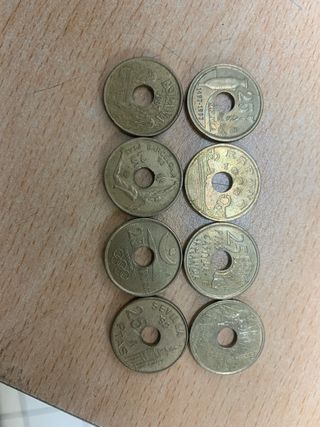 Conjunto de ocho monedas de 25 pesetas de España, con diferentes diseños y años. - Moneda de 25 pesetas de 1997. - Moneda de 25 pesetas conmemorativa 1497-1997. - Moneda de 25 pesetas de Barcelona 92. - Moneda de 25 pesetas de Castilla-La Mancha. - Moneda de 25 pesetas de Sevilla 92. - Tres monedas adicionales de 25 pesetas con agujero central.