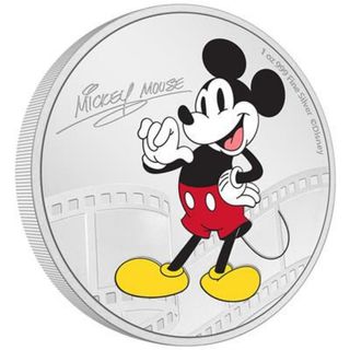 Onza de plata aniversario Mickey Mouse. - Peso: 1 onza. - Pureza: 99.9% plata fina. - Diseño: Mickey Mouse con borde de película. - Licencia: Disney.