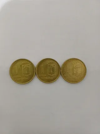 Conjunto de cinco monedas de 1 peseta de España, con diferentes años. - Cada moneda tiene el número '1' y el escudo de España. - El texto 'PESETA' aparece en cada una. - años 1984-1985-1986-1987-1988 (ref. 3009)