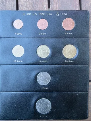 Conjunto de monedas de prueba del Euro del año 1998. - Incluye monedas de 1, 2, 5, 10, 20 y 50 céntimos. - También incluye monedas de 1 y 2 Euros. - Presentado en un estuche.