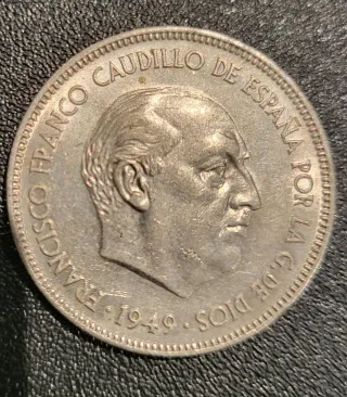 Moneda conmemorativa de Francisco Franco de 1949. - Diseño de Francisco Franco Caudillo de España. - Año de acuñación: 1949. - Inscripción: POR LA G. DE DIOS.