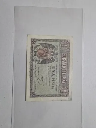 Billete de 1 peseta (30 de abril de 1938) emitido en Burgos. Una pieza histórica imprescindible de la Guerra Civil Española. Estado y detalles: -Conservación: Muy buena (MBC). El papel conserva buen color, sin roturas ni manchas de óxido, solo con las señales naturales de uso y tiempo. -Fabricación: Impreso en Milán (Coen & S.C. Banconote). -Serie: D (visible en reverso). Protección: Siempre guardado en funda protectora. Ideal para coleccionistas de historia numismática española.
