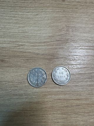 Conjunto de dos monedas de plata de 50 reis de Portugal, acuñadas en los años 1879 y 1889. - Moneda de 1879. - Moneda de 1889.