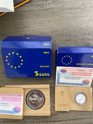Conjunto de dos monedas conmemorativas de plata de 1989. - Una moneda de 5 ECU. - Una moneda de 1 ECU. - Presentadas en estuches de madera individuales. - Incluyen certificados de autenticidad.
