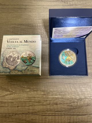 Moneda de plata conmemorativa del V Centenario de la Vuelta al Mundo. - Diseño: Paso del Estrecho de Magallanes: El Mar Tenebroso. - Valor: 10 Euros. - Año de emisión: 2020. - Incluye certificado de autenticidad.