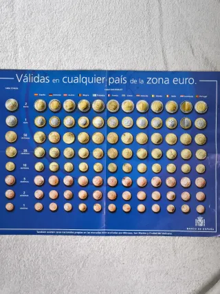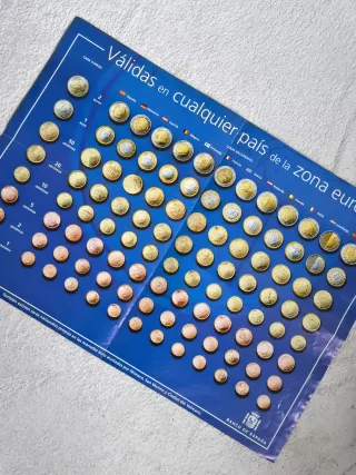 Póster informativo del Banco de España sobre las monedas de euro válidas en cualquier país de la zona euro. Medidas: 60 x 42 - Muestra las caras nacionales de las monedas de euro de diferentes países. - Incluye las denominaciones de 1 céntimo a 2 euros. - Menciona la existencia de caras nacionales propias en monedas acuñadas por Mónaco, San Marino y Ciudad del Vaticano. Nuevo y sin uso. Nunca ha sido colgado. NO NEGOCIABLE Hago envíos.