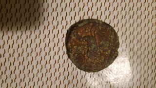 Moneda antigua con inscripciones. - Diseño con cruz central. - Inscripción BAR CINO en el borde.