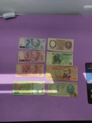 Colección de billetes de diferentes países. - Billetes de Brasil (2, 5, 10 Reais). - Billetes de Argentina (5 Pesos, 500 Pesos). - Billetes de Uruguay (50 Centesimos). - Billetes de Chile (50 Pesos).