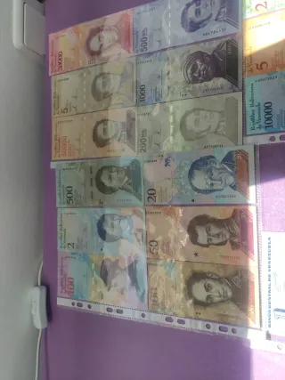 Conjunto de billetes de la República Bolivariana de Venezuela. - Billetes de diferentes denominaciones: 100, 500, 2, 50000, 20000, 5, 200, 50, 1000, 20, 500ML, 5000, 100, 500, 10000, 2000, 5, 10. - Incluye billetes con retratos de figuras históricas.
