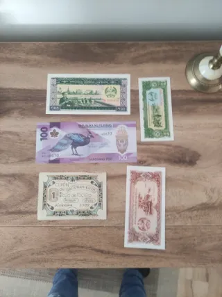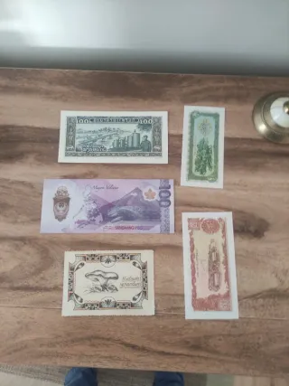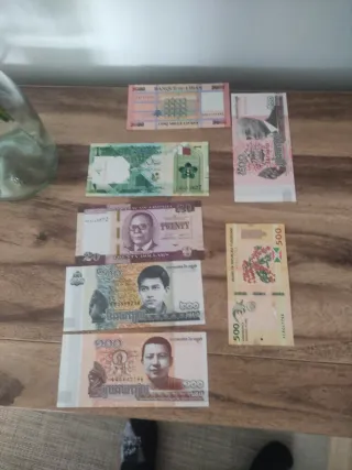 Colección de billetes de diferentes países y denominaciones. Ideal para coleccionistas. - Billetes de Líbano (5000, 2000). - Billetes de Camboya (500, 200, 100). - Billetes de Estados Unidos (20). - Billetes de Ruanda (500). - Billetes de Líbano (2000).