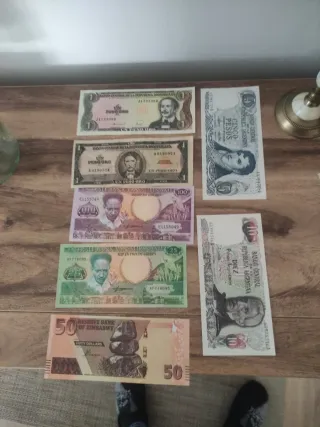 Colección de billetes de diferentes países. - Billetes de República Dominicana. - Billetes de Argentina. - Billetes de Surinam. - Billetes de Zimbabue.